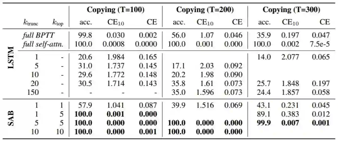 表 5:在 T=100 的复制记忆任务中训练的模型的迁移性能(最后 10 位数的准确率)。该表将使用基于时间的反向传播算法(BPTT)训练的 LSTM 以及带完全的自注意力机制的 LSTM 结果相对比。