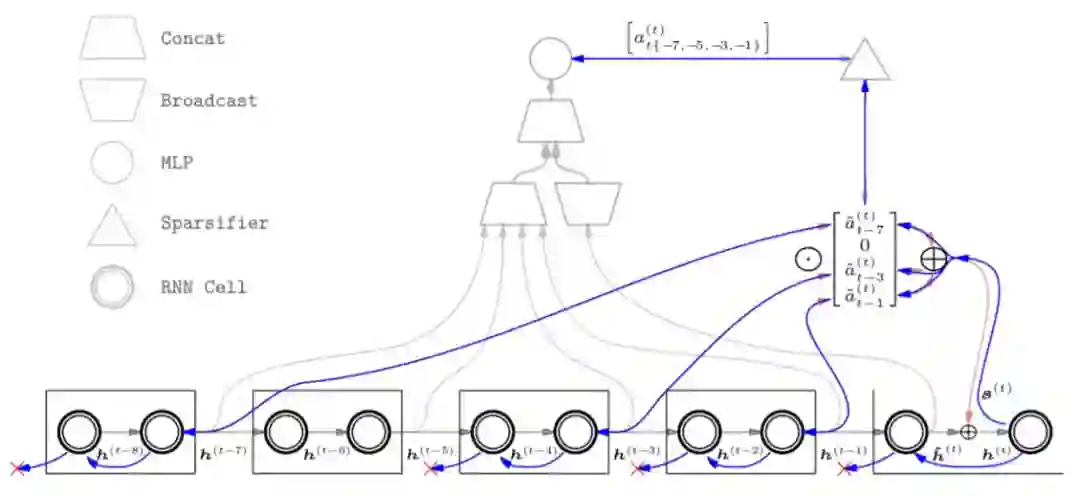 在前馈传播过程中,管理一个内存单元,并在每个时间步中最多选择过去记忆中的一个稀疏子集。我们将这个过程称之为稀疏检索。