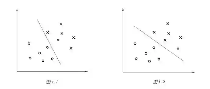 显然,图 1.2 所示的决策边界具有更大的“间隔”(margin),通常具有更稳定的分类性能。粗略地说,大间隔分类器对于未知样本的分类准确率具有更大的均值和更小的方差,比如对于图 1.1 的决策边界,未知的正类样本很大概率会“越过”边界而被错误分类,而图 1.2 的 决策边界则给了未知样本“更大的容错空间”。
