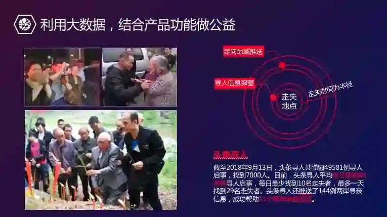 几年前,我们就开始将人工智能结合产品功能积极服务于公益。比如借由我们的精准推送,根据他的走失时间、地点,把走失者的信息推送给这些可能有信息线索的人。目前整个头条寻人,已经找到了超过 7000 人,应该是中国寻人机构找回走失者最多的,平均每天至少找到 10 位,最多的时候一天找回 29 位。我们还帮助很多台湾老兵找到了大陆的亲人,帮助 51 个家庭跨越海峡两岸团聚。