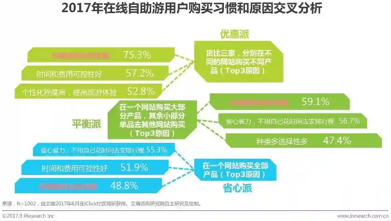 根据艾瑞调研数据交叉分析结果,喜欢货比三家的“优惠派”表示,价格相对比较优惠、时间和费用可控性好、个性化程度高提高旅游体验是产生此购买的主要原因,用户占比分别为75.3%、57.2%和52.8%;而喜欢在一个网站购买大部分产品的“平衡派”用户则表示,价格相对比较优惠、省心省力和种类多是主要原因,用户占比分别为59.1%、56.7%和47.4%;此外,喜欢在一个网站购买全部产的“省心派”用户则主要是为了省心省力、控制时间和费用以及购买到优惠价格的产品。综合三类用户购买习惯的原因来看,优惠的价格仍是用户最核心关注点。