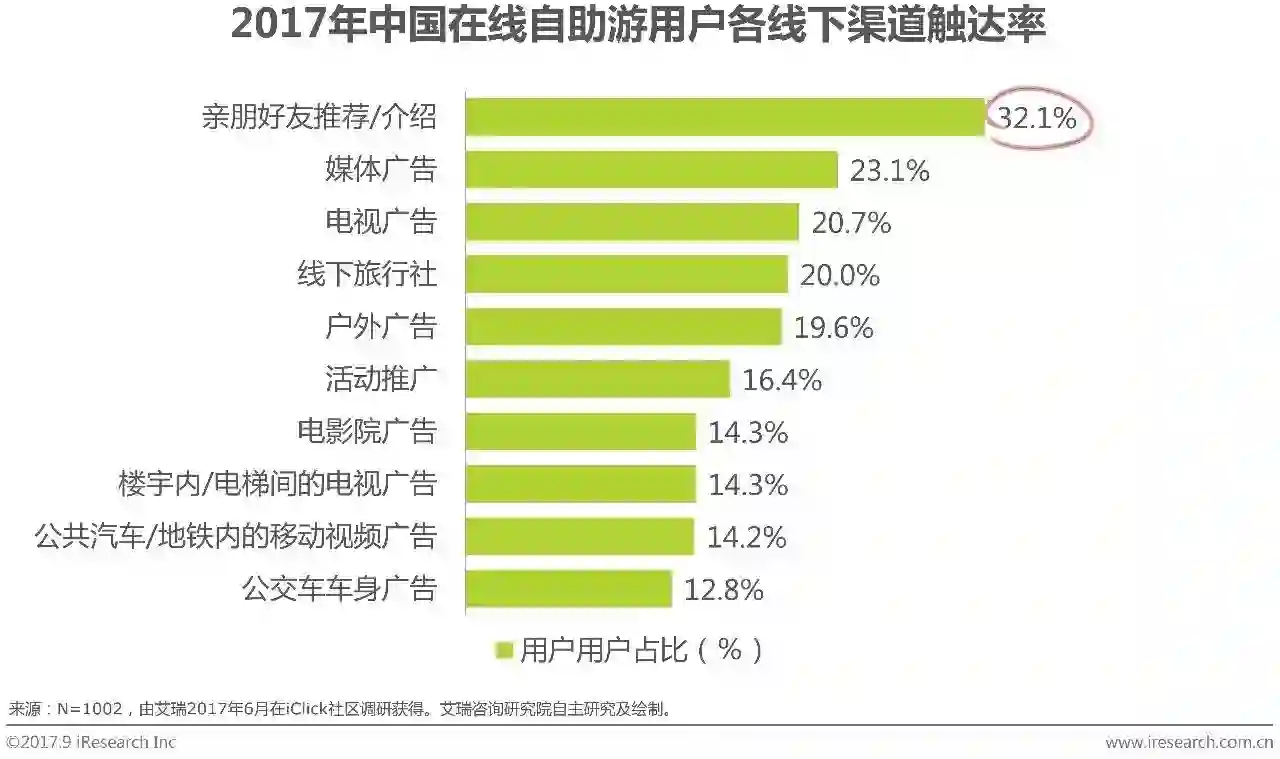 此外,线下用户触达率Top3渠道分别为亲朋好友推荐/介绍占比32.1%、媒体广告23.1%和电视广告20.7%,现阶段口碑传播仍为我国自助游服务用户触达核心渠道。