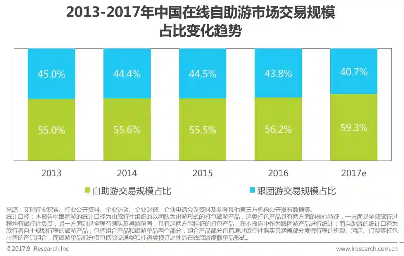 艾瑞数据显示,2013-2016年自助游在在线度假市场中的占比持续缓慢增长,2016年占在线度假市场交易规模的56.2%,相较于2013年占比55.0%,增长1.2个百分点。