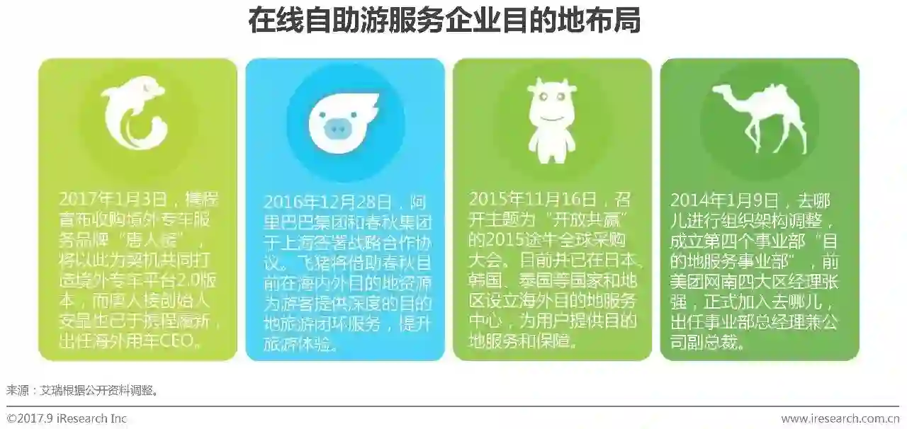 近几年去哪儿网成立目的地服务事业部、途牛网陆续在日本和韩国等地设立海外目的地服务中心、飞猪与春秋集团就海内外目的地资源达成战略合作协议、携程收购海外目的地专车服务“唐人接”,各在线旅游核心企业加紧对于目的地服务布局。