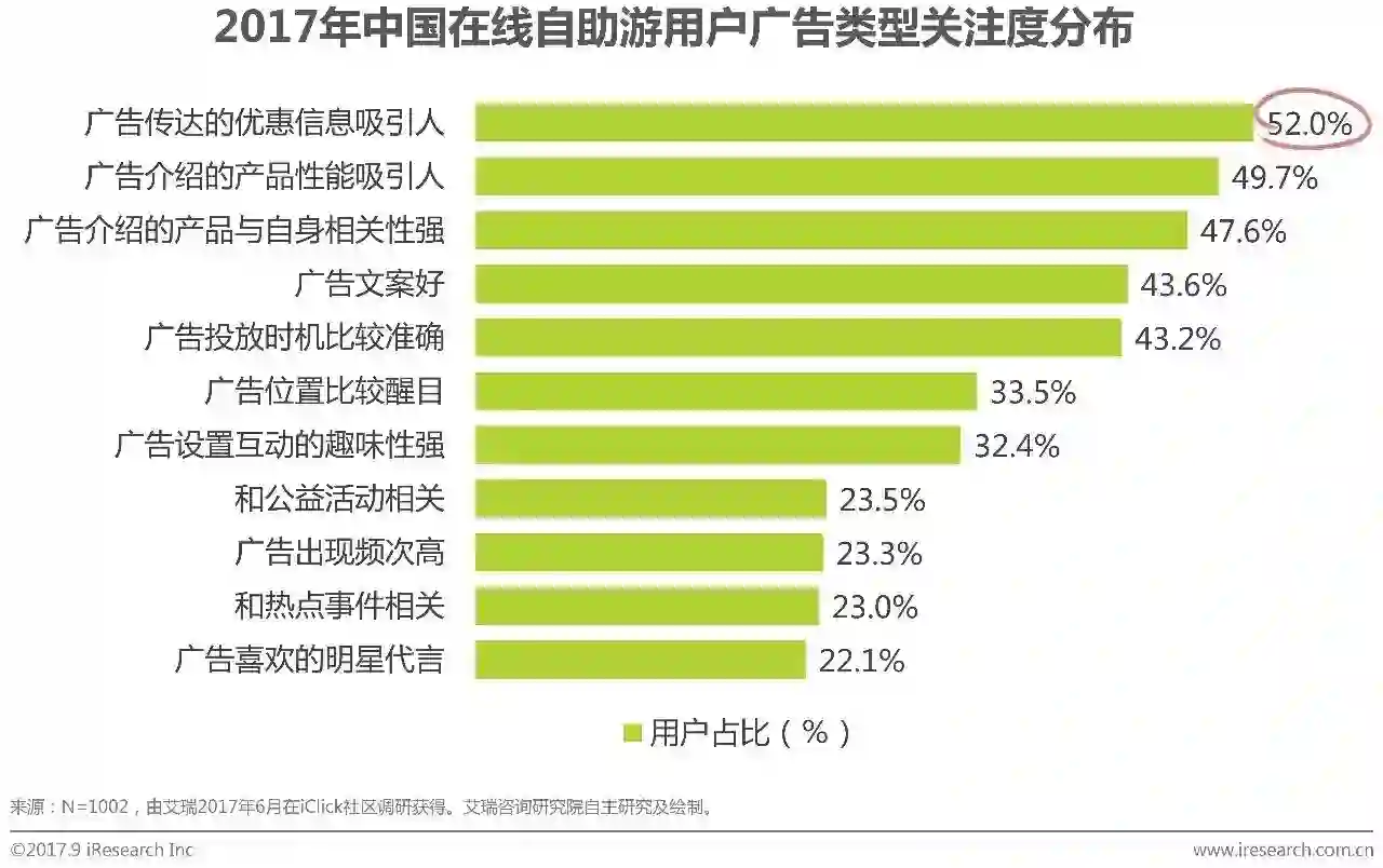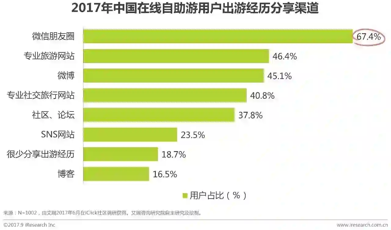 根据艾瑞调研数据显示,中国在线自助游用户在广告关注度方面,优惠信息仍最具吸引力,有52.0%的在线自助游用户表示广告中传达的优惠信息吸引人会增加他们对旅游广告的关注度。此外,微信朋友圈是在线自助游用户的核心游历分享渠道且用户占比优势明显高达67.4%,其次是专业旅游网站46.4%和微博45.1%。