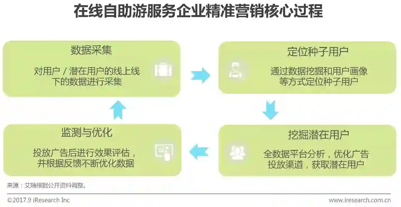 在线自助游服务企业在精准营销的过程中主要包括四个主要方面:(1)数据采集:线上通过在用户设备上嵌入SDK、API接口等方式获取数据,线下则通过WiFi探针、无线基站等方式获取;(2)定位种子用户:在获取的数据基础上通过通过数据挖掘和用户画像等方式定位种子用户;(3)挖掘潜在用户:将种子用户放在全数据平台,通过数据分析获取潜在用户活跃方式,以此优化广告投放渠道,增加营销精准度,获取潜在用户;(4)监测与优化:广告精准投放之后,持续进行数据监测并评估广告效果。不断加深用户了解,优化数据,从而形成精准营销的闭环。