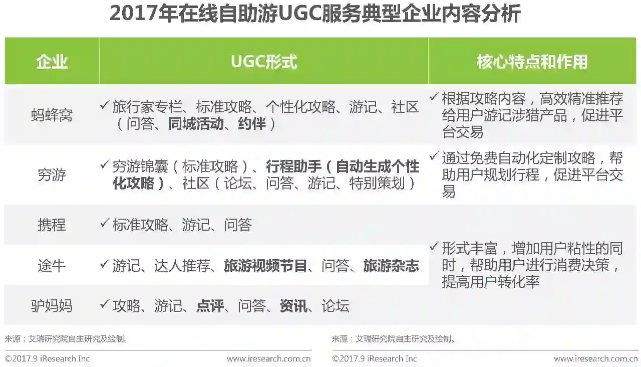 艾瑞分析认为,核心企业纷纷发力UGC布局的原因主要为(1)通过UGC服务,提供用户在信息获取方面的使用体验,增加用户粘性;(2)UGC在为用户提供旅行基础信息的同时,也起到帮助用户进行消费决策的作用,存在软广植入从而进行商业变现的潜力。