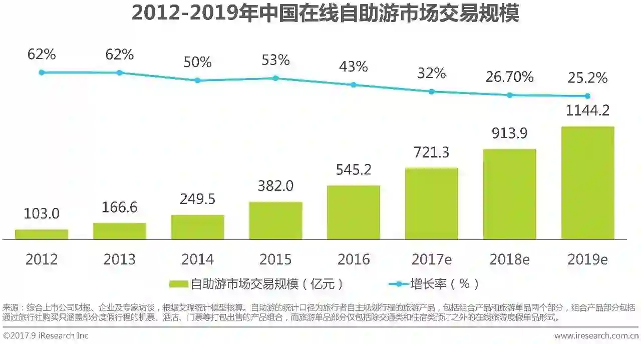艾瑞数据显示,2016年中国在线自助游市场保持高速增长,市场交易规模达到545.2亿,预计2019年中国在线自助游市场交易规模将超1100亿。此外,中国在线度假游市场中,在线自助游市场占比持续提高,由2012年的55.5%,增长至2016年的56.2%,