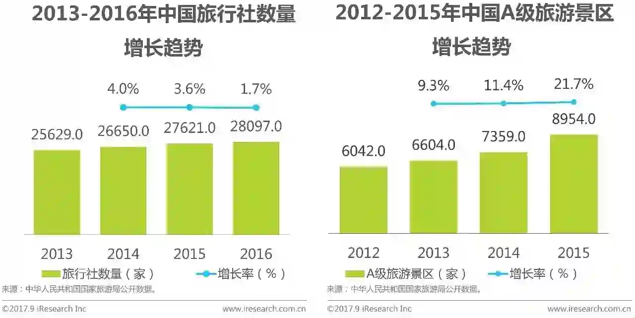 艾瑞分析认为,刺激包括旅行社和旅游景区等资源持续增长的原因主要包括:(1)国内外旅游人次持续增长,用户旅游需求增长是基础;(2)国家积极推进共给侧改革、全域旅游、“旅游+”、旅游市场治理和旅游外交等,促进旅游业发展;(3)大型旅游集团包括国旅、锦江、首旅和携程、其他行业巨头包括万达、复星、海航、BAT和新美大等企业,通过并购和整合等资本方式频繁布局,寻求更多的市场增长。