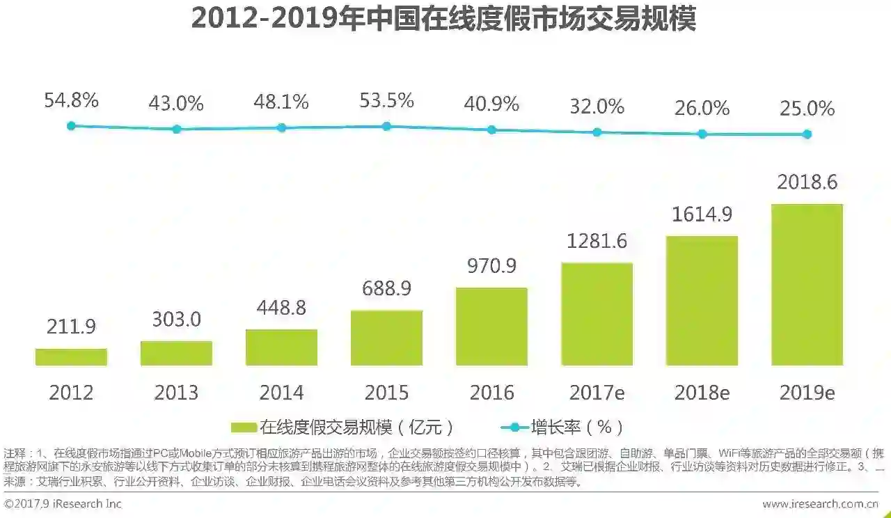 艾瑞分析认为:旅游人次的持续增长的原因主要为(1)国家经济的增长,人民生活水平的不断提高,为丰富生活体验,对于休闲消费的支出增多;(2)随着社交媒体对于现代人生活的影响逐渐加深,用户对于旅游出行的经历分享,成为满足用户的社交满足感的方式之一,用户对于旅游消费积极性变高;(3)随着今年互联网的快速发展,OTA企业间竞争加剧,阶段性的价格战降低了用户出行成本。
