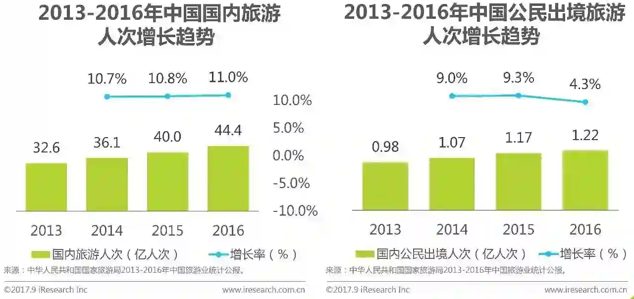 根据旅游统计公报显示,2013-2016年中国国内旅游人次和国内居民出境人次均保持增长,其中中国国内旅游人次增长率稳定在10%以上,并有持续增长趋势。2016年中国国内旅游人次和国内居民出境人次分别达到44.4亿人次和1.2亿人次,随着用户旅游经验的积累,对于个性化和深度旅游需求不断增加,为在线自助游奠定发展基础。