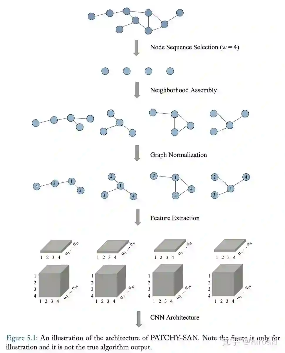 Patchy-SAN。首先,为每个节点精确选择并归一化k个邻居。然后,将归一化的邻域用作接受域(receptive filed)作卷积运算,试图将图学习问题转化为常规的欧氏几何数据的学习问题。该方法具有四个步骤(如下图所示):