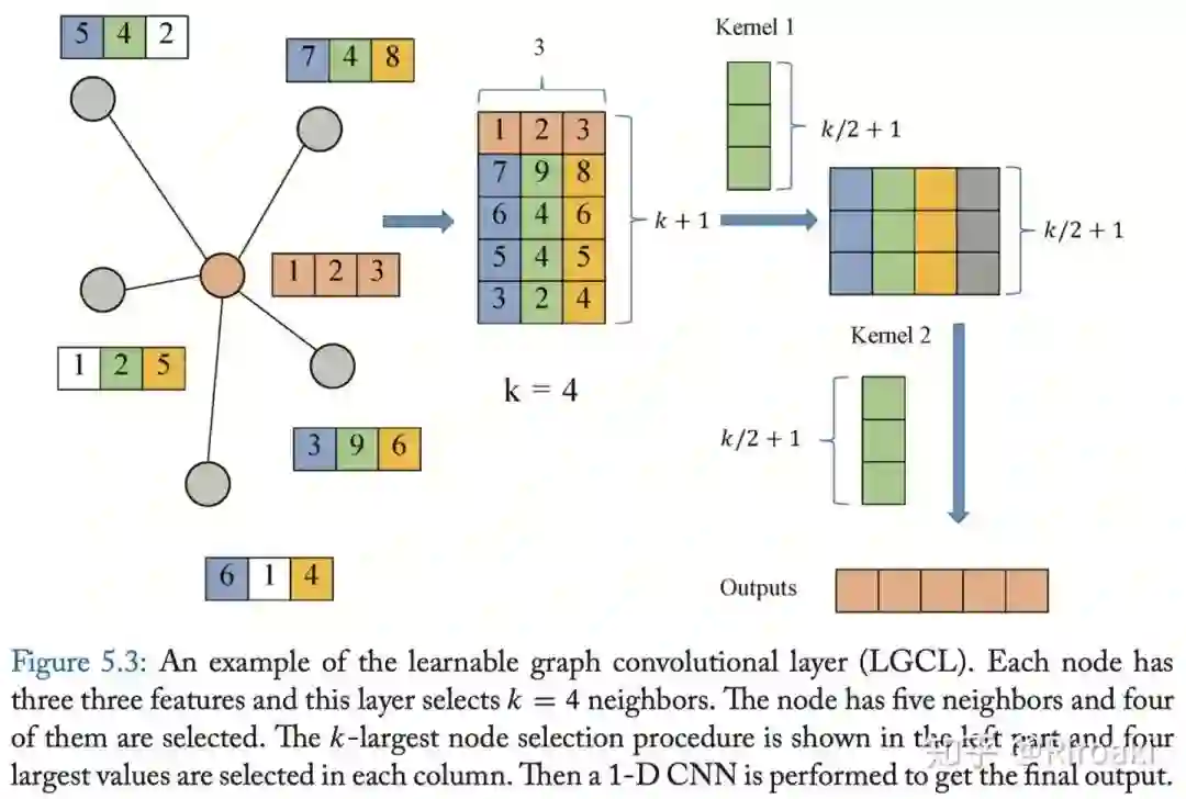 LGCN(Learnable GCN)。该网络基于可学习图卷积层(LGCL)和子图训练策略。LGCL利用CNN作为聚合器。它对节点的邻域矩阵进行最大池化,以获取前k个要素元素,然后应用1-D卷积来计算隐藏表示。计算过程如下图: