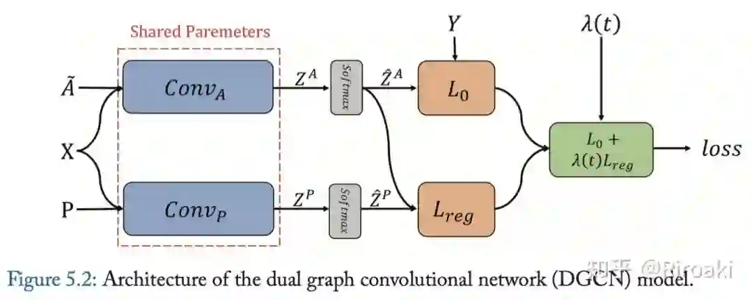 DGCN(Dual GCN)同时考虑图上的局部一致性和全局一致性。它使用两个卷积网络来捕获局部/全局一致性,并采用无监督的损失来聚合两个部分。模型结构如下图: