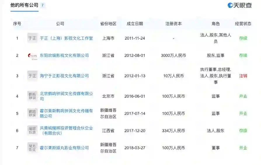 于正工作室便是欢娱影视的前身。2012年,东阳欢娱影视公司正式成立,于正工作室挂入东阳欢娱旗下。他本人分别通过直接持有东阳欢娱影视文化有限公司62.22%的股权,以及通过共青城7%股份,前者占有东阳欢娱11.11%的股份比例。总计持股63%,是毫无疑问的大股东。与此同时,于正也以不定比例分别持股了海宁于正影视文化有限公司,于正(上海)影视文化工作室,以及霍尔果斯欢娱影视文化有限公司等7家企业。