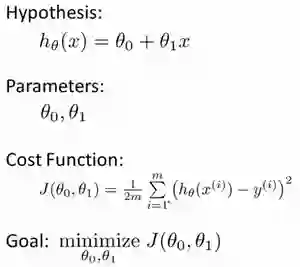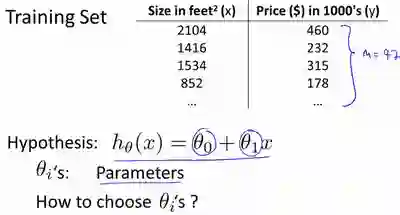 我们使用线性回归算法来预测,所以取假设函数 Hypothesis 的表达式为 2 个参数(theta_0,theta_1)线性函数。