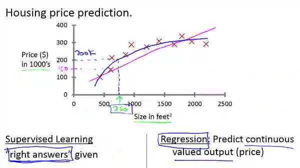 比如用监督学习来根据房屋面积预测房价,那么在训练数据集中每个房屋面积都对应一个确定的价格(750, 200)。
