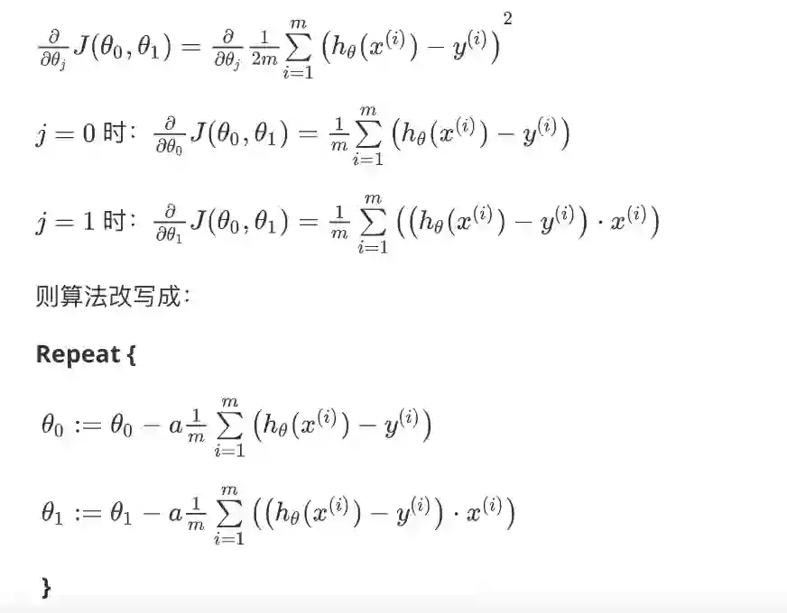 当你理解了梯度下降算法的公式后,便可以看出求解的关键点就在于求出代价函数关于参数 theta_i 的偏导数,求偏导是高数中很基础的方法,这里就不介绍了,直接看下求出的 2 个偏导数: