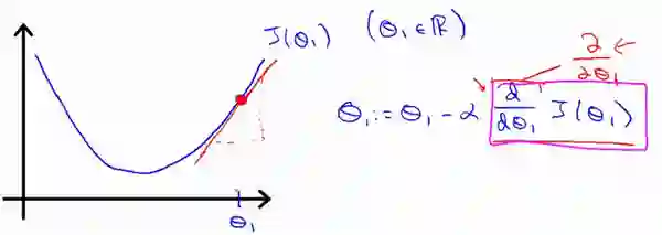 为了方便理解,上面的代价函数假设 theta_0 = 0,红色的直线线表示 theta_1 点的切线,切线斜率即右端的红框中的对 theta_1 的偏导数,且切线的斜率大于 0。