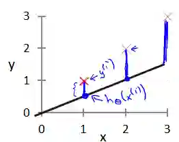 可以将 Cost Function 的求和值理解就是下图中三条蓝色线段的长度平方之和再除以 1/ 2m,表示当前预测的函数值与实际的函数值之间的总的误差:
