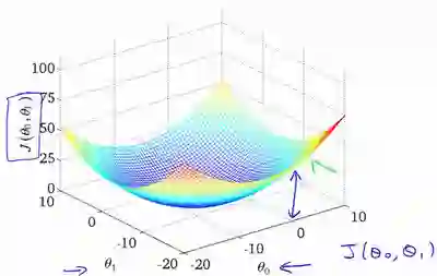 上面一个参数 theta_1 的代价函数容易理解,如果是两个参数的 J(theta_0, theta_1) 的代价函数,函数图形稍微复杂些,不过也不是很难。
