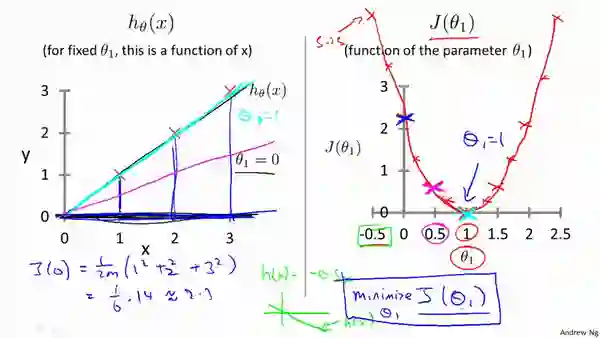 这时误差达到最小,对应的函数参数为 theta_0 = 0,theta_1 = 1,这就是训练的最终结果了。