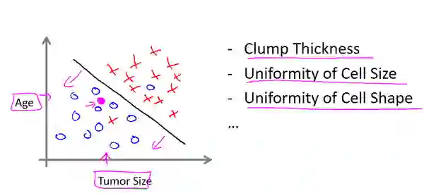 红×和蓝圈代表两种不同类型,中间的直线是我们算法预测的分类边界函数。