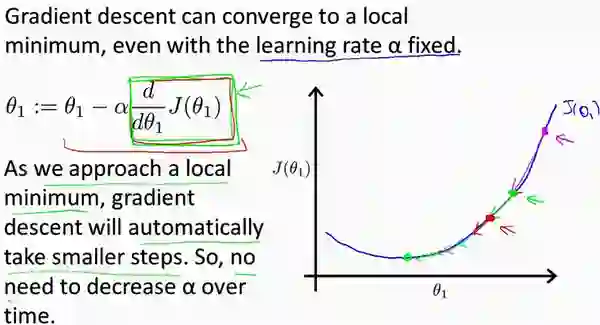 影响梯度下降算法的一个重要变量是学习率 a,它对更新会产生如下作用: