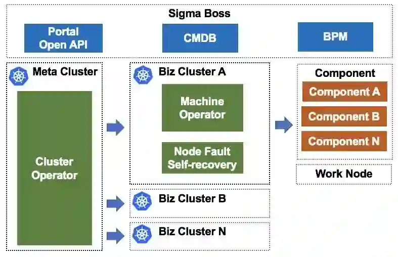 业务集群中部署有 Machine-Operator 和节点故障自愈组件用于管理业务集群的工作节点,提供节点新增、删除、升级和故障处理能力。