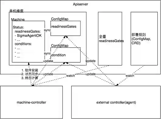 Machine-Operator 根据标签获取节点相关的所有子终态 Condition ConfigMap,并同步至 Machine status 的 conditions 中;