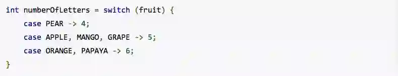 使用Java 12,switch不仅可以作为语句也可以作为表达式。 无论作为语句或者作为表达式,switch都可以使用传统/简化的作用域和控制流行为。 这将有助于简化代码,并为在switch中使用模式匹配铺平道路。