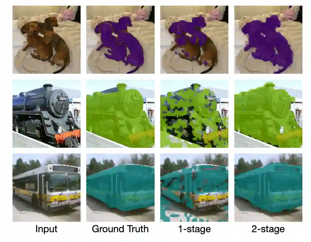 研究者还在下图 5 中比较了 1-stage 和 2-stage 的视觉零样本语义分割结果。