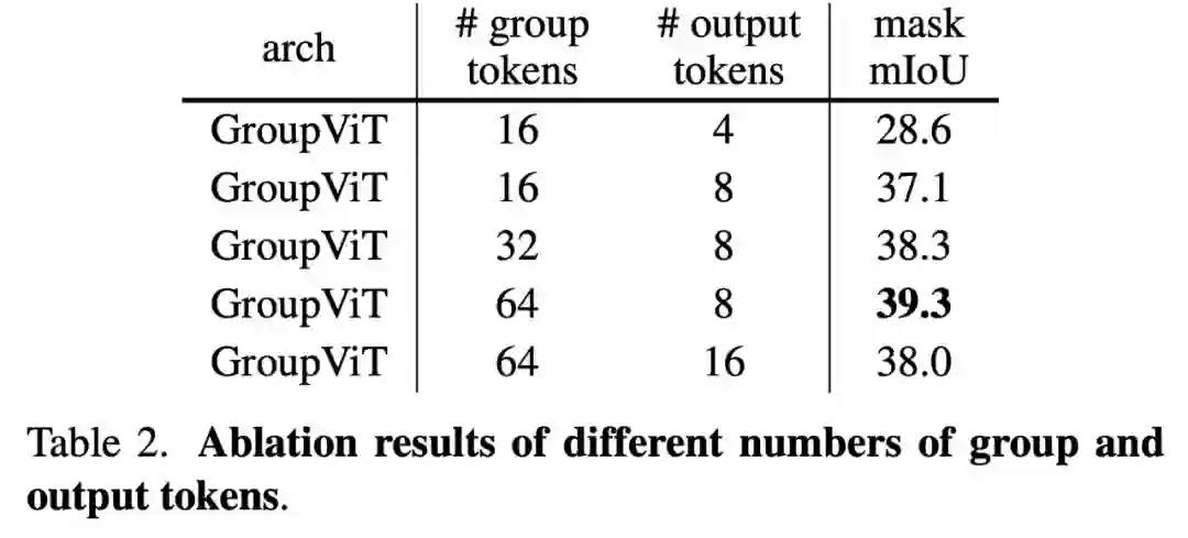 。在下表 2 中,研究者比较了不同的组 token 和输出 token。他们观察到,不断增加组 token 会持续提高性能。从概念上讲,每个组 token 代表不同的语义概念。所以更多的组 token 可能有助于 GroupViT 学习对更多的语义概念进行分组。尽管组 token 的数量远少于现实世界中的类别数量,但每个组 token 都是 384 维嵌入空间中的 1 个特征向量,但它可以表示比 1 更多的概念。他们还对不同的输出 token 进行了实验,发现 8 是最优的,类似于 [64] 中的发现。