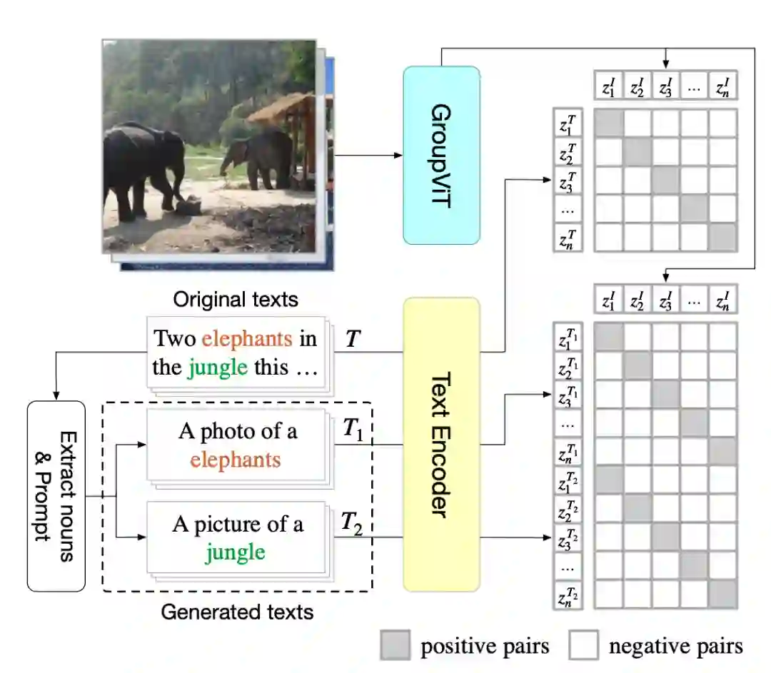 。只要通过文本监督学习,分组机制就可以自动生成语义片段。方法概览如下图 1 所示,通过对具有对比损失的大规模配对图文数据进行训练,可以让模型不需要任何进一步的注释或微调的情况下,能够零样本迁移学习得到未知图像的语义分割词汇。