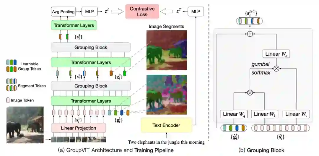 图 2:(a) GroupViT 的架构和训练流程。(b) 分组块的架构。