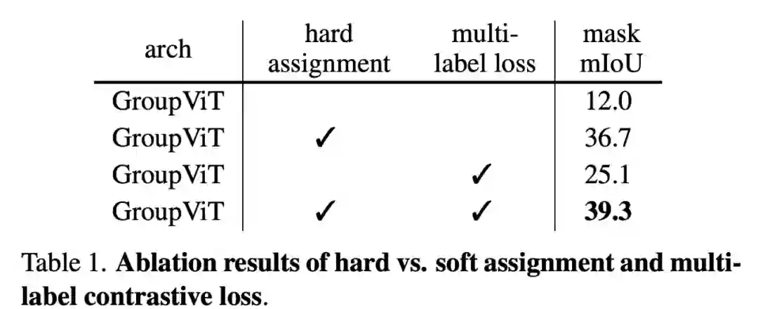 。研究者研究了表 1 的第二列中,添加多标签对比损失的效果。将多标签对比损失添加到标准损失(公式 8)中,硬分配和软分配的性能分别提高了 13.1% 和 2.6%。使用多标签对比损失,训练和推理期间的输入文本采用类似的提示格式。他们推测这种一致性有助于 GroupViT 更好地将学习到的图像片段分类为标签的类别。