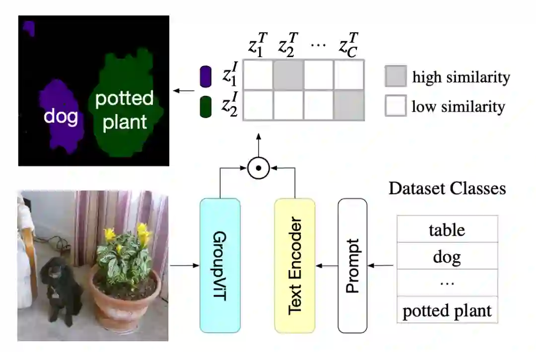 没有任何像素级标签,并且仅通过对比损失进行图像级文本监督的训练,GroupViT 成功地学会将图像区域组合在一起并以零样本方式迁移到多个语义分割词汇表;