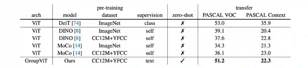 研究者将 GroupViT 的零样本语义分割性能与其它零样本基准、基于 ViT-S 的全监督迁移方法进行了比较。结果详见下表 4 和表 5。