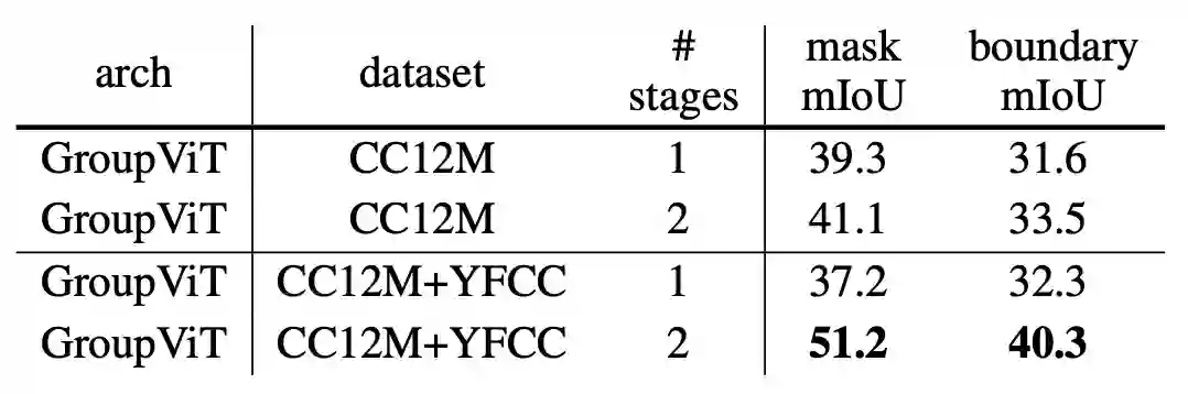 。在下表 3 中,研究者比较了 1-stage 和 2-stage GroupViT 架构。