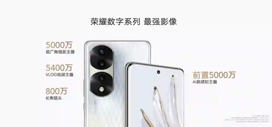 而荣耀 70 也是首发 IMX800 传感器,搭载 58 度双曲屏,配备 5400 万像素 IMX800 视频主摄和 5000 万像素超广角微距主摄以及 200 万像素的景深镜头,前置 3200 万。此外,该机搭载 4800mAh 电池和 66w 超级快充,也有四款配色,重量是 178g,厚度是 7.91mm。