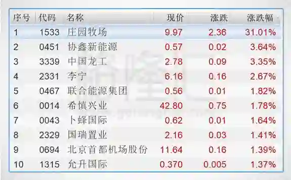 今日港股通标的中涨幅前五的个股是庄园牧场(01533.HK)、协鑫新能源(00451.HK)、中国龙工(03339.HK)、李宁(02331.HK)、联合能源集团(00467.HK)。