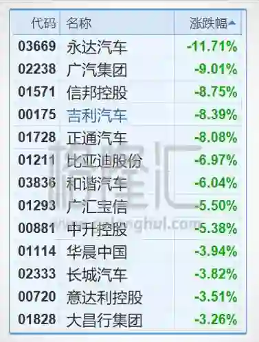今日多只汽车股连带下跌,其中永达汽车大跌11.7%,广汽跌9%,信邦控股、吉利汽车和正通汽车跌幅均超8%,比亚迪股份、和谐汽车、广汇宝信和中升控股跌幅均超5%,长城汽车跌近4%。