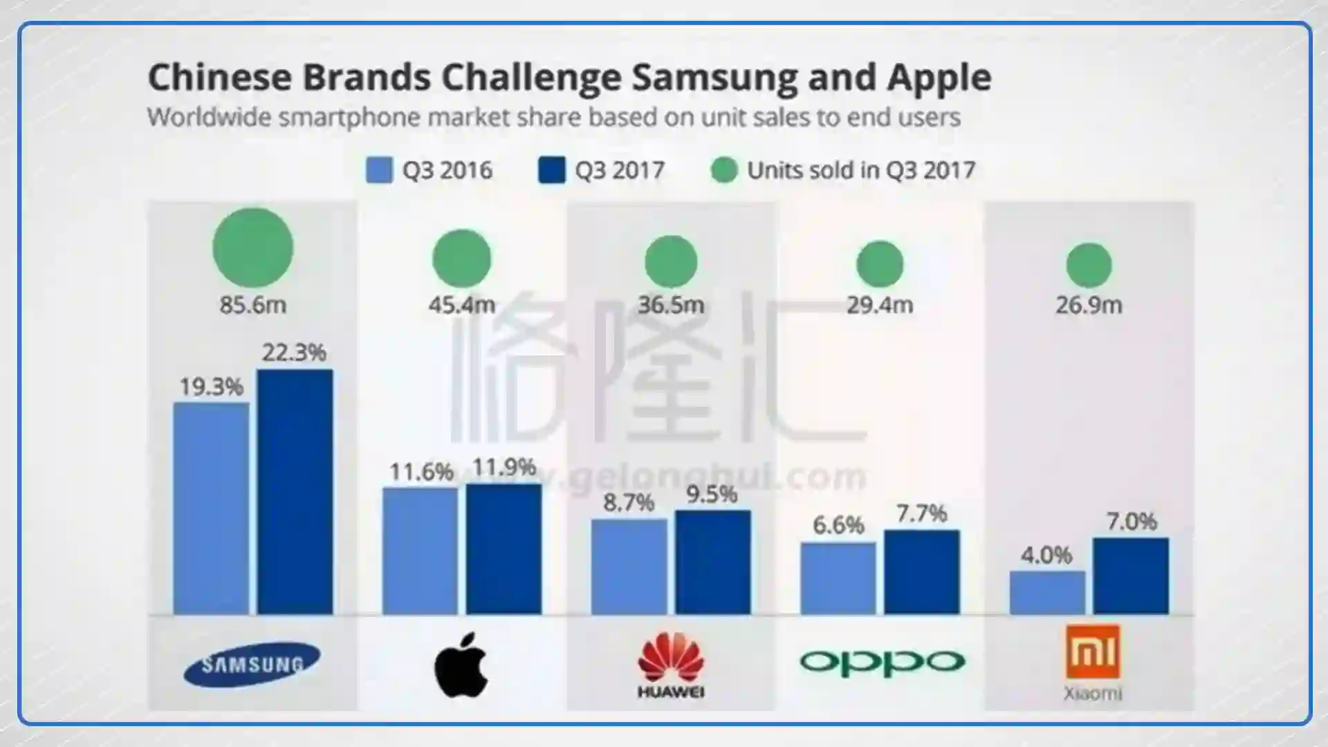 此外,2017年三季度全球智能手机销量数据显示,销量排名前五的厂商分别为三星、苹果、华为、OPPO和小米,在前5名中,从增长率来看,苹果的增长最小,第三季度仅卖4540万台iPhone,市场份额11.9%,同比仅增0.3个百分点。