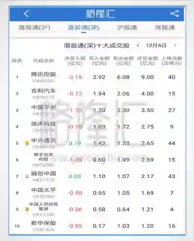今日港股通(深)前十大成交个股是腾讯控股、吉利汽车、中国平安、瑞声科技、中兴通讯、舜宇光学科技、融创中国、中国太平、中国人民保险集团、新华保险。其中净流入最多的个股是中兴通讯,净流入1943.24万港元;净流出最多的个股是腾讯,净流出3.16亿港元。