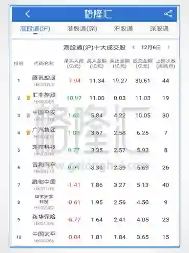 今日港股通(沪)前十大成交个股是腾讯控股、汇丰控股、中国平安、广汽集团、瑞声科技、吉利汽车、融创中国、舜宇光学科技、新华保险、中国太平。其中净流入最多的个股是汇丰控股,净流入10.97亿港元;净流出最多的个股是腾讯,净流出7.94亿港元。