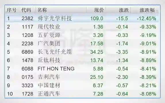 今日港股通标的中跌幅前五的个股是舜宇光学科技(02382.HK)、现代牧业(01117.HK)、五矿资源(01208.HK)、广汽集团(02238.HK)、长飞光纤光缆(06869.HK)。