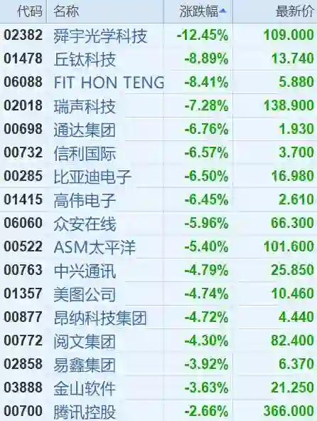 今日苹果概念股集体走跌,其中舜宇光学(02382.HK)领跌12.45%,丘钛科技(01478.HK)和鸿腾(06088.HK)跌幅均超8%;瑞声科技(02018.HK)跌超7%;通达(00698.HK)、比亚迪电子(00285.HK)和高伟电子(01415.HK)均跌超6%;富智康(02038.HK)跌超2%。