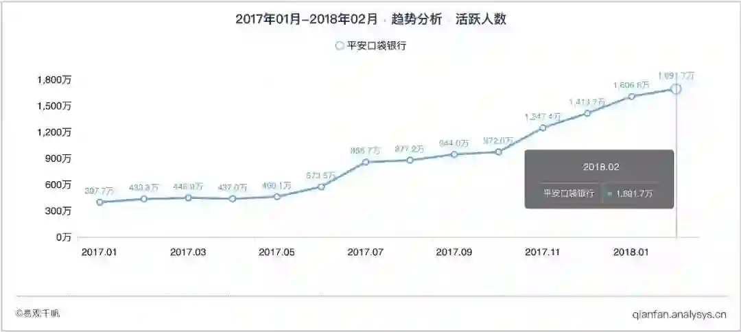 根据易观千帆数据显示,2018年1月,平安口袋银行APP用户活跃规模1606.6万,而在2017年1月月活规模仅为397.7万,一年时间,同比增幅超过同比增长304%,规模位居行业第五,同比增速远超其他手机银行APP。而在今年2月,平安口袋银行继续增长,活跃用户达到1691.7万,实现环比增长5.30% 。