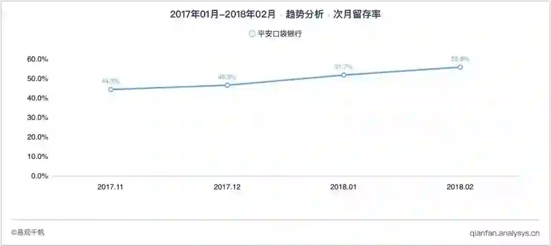 在用户启动次数及使用时长上,平安口袋银行在去年一年来,都呈现出阶梯式上升,2018年1月启动次数14949.1万次,同比增幅567.7%;使用时长720.3万小时,同比增幅625.4%。在用户留存方面,平安口袋银行的数据也表现堪佳,次月留存率从2017年11月的44.3%增长为2018年2月份的55.8%,在银行应用中保持较高水平。