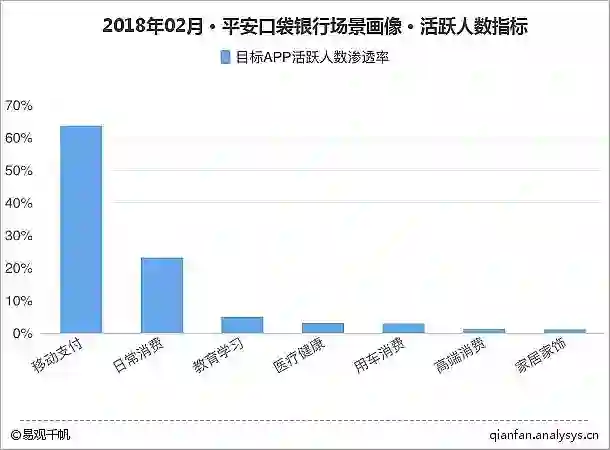 从平安口袋银行2018年2月用户消费场景画像来看,在医疗健康、用车消费等领域,还有很大用户提升空间。而平安集团另外超级流量APP就有汽车之家、平安好医生、平安好车主,正好形成客群互补。而口袋银行正在打造以客户为中心的一站式综合金融线上服务平台,构建连通集团内外的互联网“金融+生活”的生态系统,藉此承接集团内的获客迁徙及全客群多款应用的深层经营,为不同类型客群带来一站式、智能化和个性定制的全新金融生活服务,相信口袋银行还有很大的用户增长和活跃提升空间。